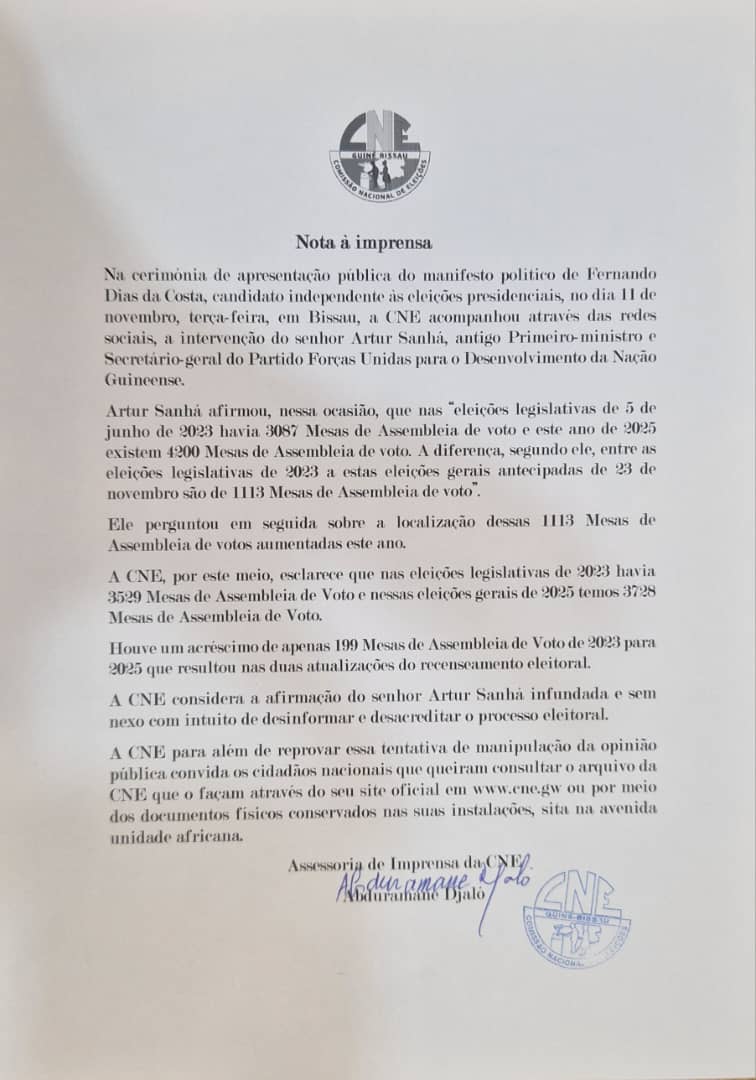 Comunicado da Comissão Nacional de Eleições (CNE) na sequência do falso anuncio de recrutamento dos funcionários e agentes eleitorais, nas redes sociais, para as eleições gerais de 2025.